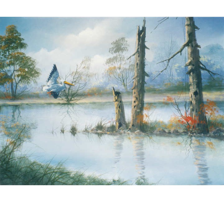 A graceful pelican glides low over a quiet marsh, its wings spread wide as it passes over still water dotted with reeds, weathered tree stumps, and soft reflections beneath a misty sky. In this beginner level acrylic painting lesson, Jerry guides you step-by-step through creating this peaceful wildlife scene in a 90 minute session on an 18x24 canvas, capturing both motion and atmosphere in a calm natural setting.